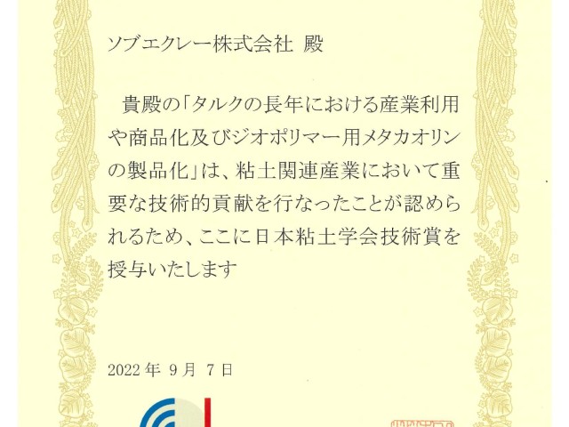 この度日本粘土学会より、技術賞を頂きました。